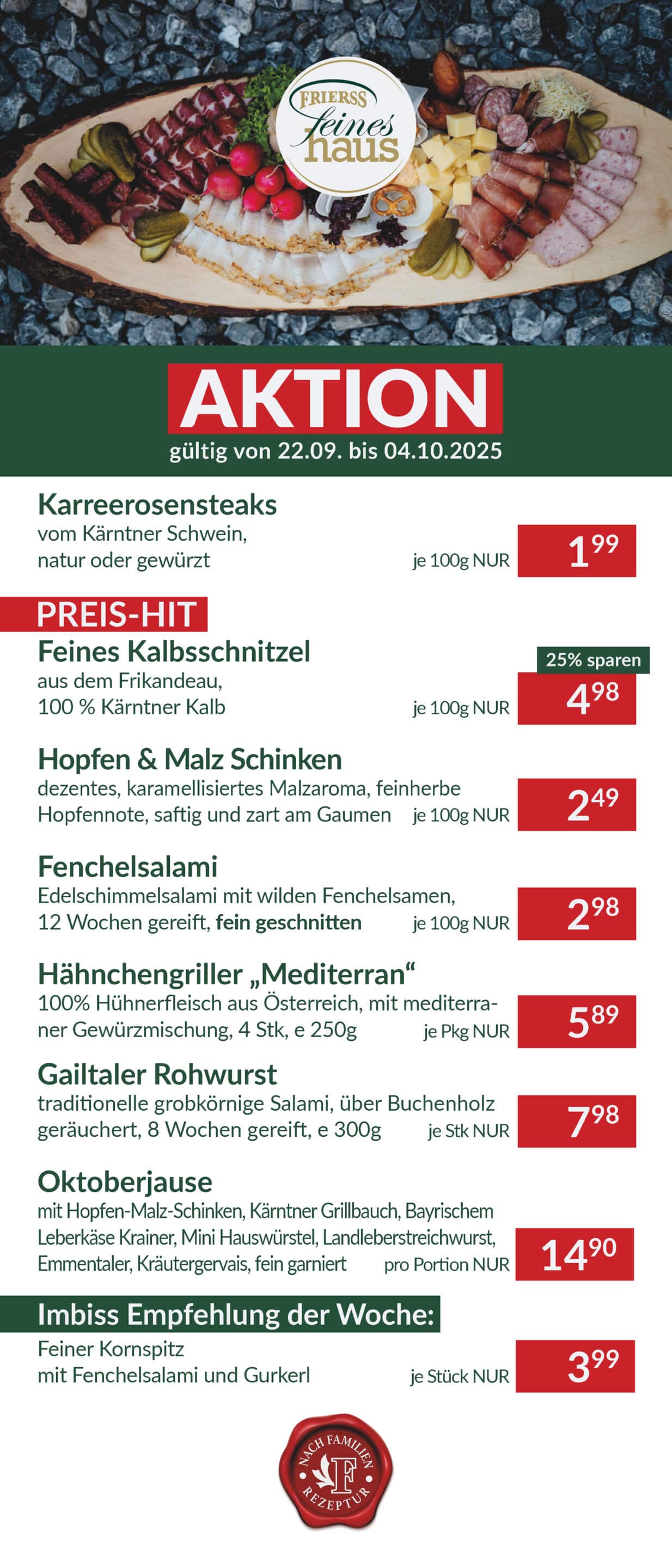 Entdecken Sie die umfassende Vielfalt an Wurst- und Schinkenspezialitäten in den Frierss Feinkostgeschäften in Villach und Klagenfurt, den kulinarischen Top-Feinkostadressen des Landes. Die besondere Qualität und eine vielfältige Auswahl regionaler Produkte sowie eine charmante Fachberatung machen hier das Einkaufen zu einem genussvollen Erlebnis. Unsere Fleischerfachgeschäfte begeistern mit delikat bestückten Feinkosttheken und edlen Feinkostregalen und bieten eine besondere Auswahl, die von perfekt gereiften Steaks über mehr als 100 Wurst- und Schinkenspezialitäten bis hin zu feinstem Prosciutto aus Kärnten reicht. Dazu bieten wir ausgewählte Alpe-Adria-Delikatessen, exquisite Naschereien und eine handverlesene, kleine Weinauswahl, die unser Angebot abrunden.
